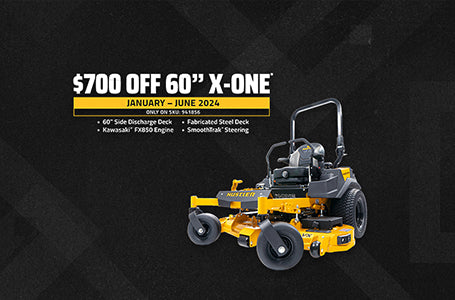 Save for a limited time. Posted onJan 1, 2024 January 1st through June 30th enjoy $700 off the 60" Hustler X-one with Kawasaki FX850 engine. SKU 941856 Only. Regularly Advertised Price: $12,699 Promo Price: $11,999 1 60" Side Discharge Deck 27 HP....